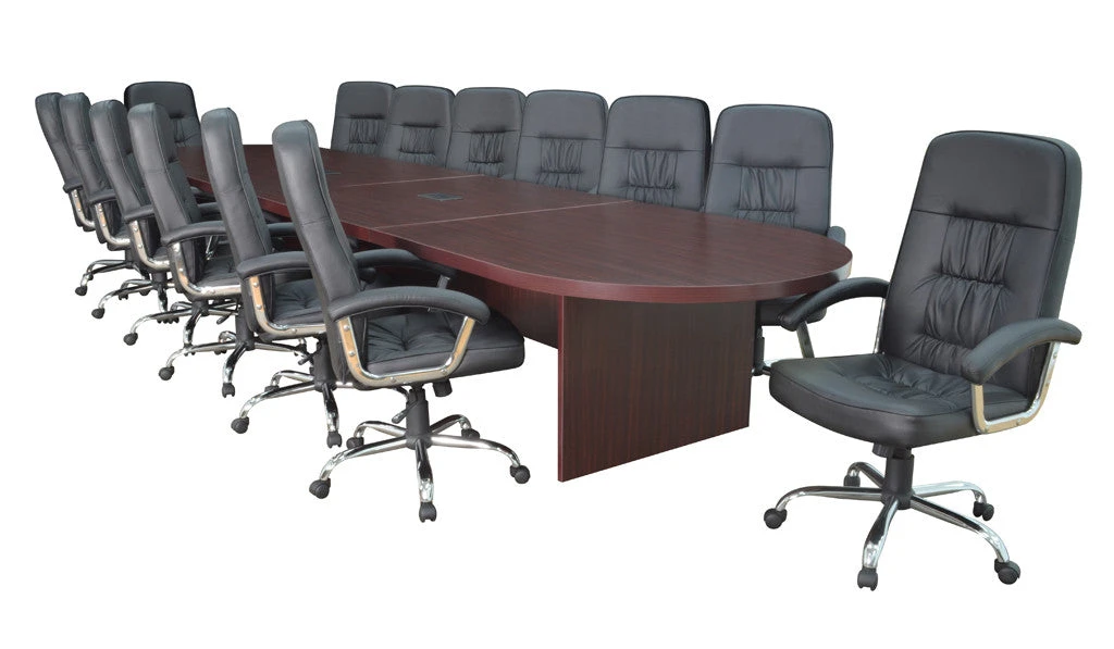 This premium conference table from high end manufacturer Regency will meet your company’s needs perfectly. Choose between smooth hand-rubbed cherry and elegant hand-rubbed mahogany finishes, enabling the table to match whatever decor your office has. You won’t find a longer conference table option out there, since you can choose from lengths up to 288″ (24 feet!). No matter the size of your team, you’ll all be able to fit around the table to plan your next great idea. The quality on this table is top-notch, and it’s made from the finest materials and the top coated in melamine to resist any staining or scratching. It also comes with between one and four plug in grommets, depending on the size of table you choose, where team members can plug in their laptops to power or the network.
