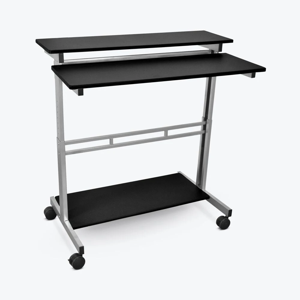 With a powder-coated steel base and stable wheels, this mobile sit-stand office desk is the perfect option for when you have to move around during the day or give presentations. It has two shelves, one for a screen and one for a keyboard or other office or presentation supplies. This desk is mobile and sturdy, a great option for any office.ย