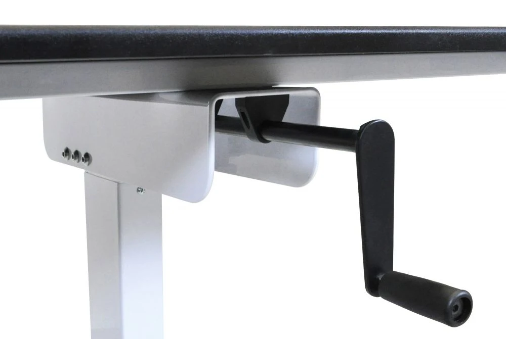 This is the perfect option for a mobile workstation or office desk. It has a wide top with plenty of room for your computer and basic supplies, while raising and lowering in height with an easy crank tucked beneath the surface. The top is made of a dark veneer, while the sturdy steel column contrasts in white and locking casters finish off the look in black. The solid frame and sharp looks blend perfectly in the office, medical clinic, or home.