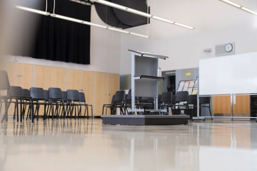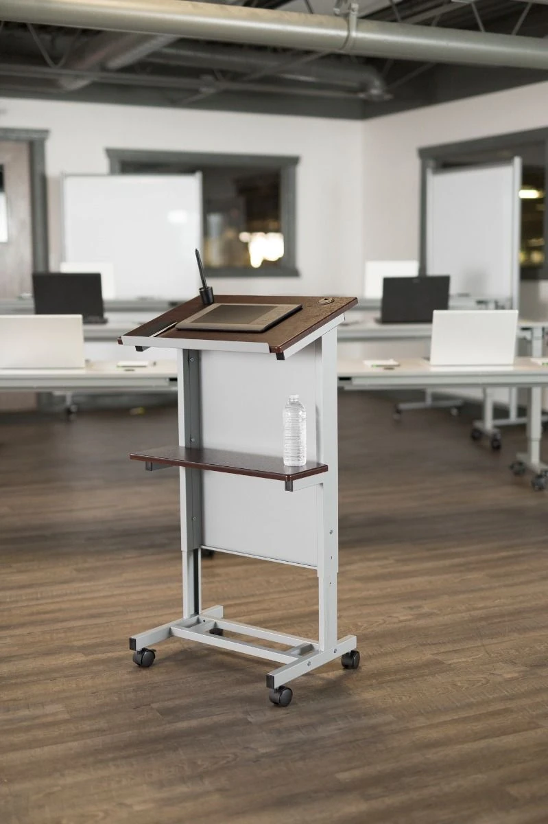 This rolling lectern or workstation is the perfect option for the worker on the go. Roll it around to different rooms, or use as a lectern when giving presentations. It has a 17 degree angle making it easy to read papers or a tablet, and a lip so nothing will slide off. The frame is made from powder-coated steel and the top is a dark walnut wood veneer. It also has one shelf for easy access to tools or supplies. It has four casters, two with locking brakes.