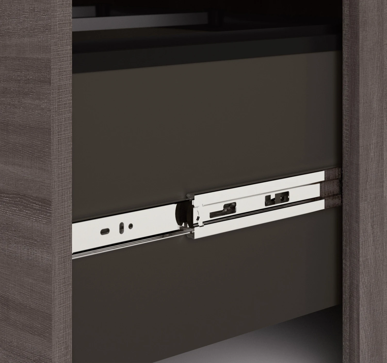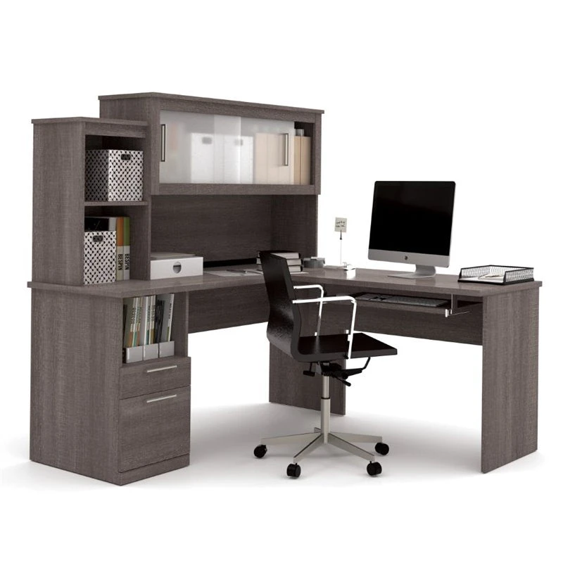 This premium L-shaped desk from Bestar comes in a sleek bark gray finish with silver handles and frosted glass hutch doors that combine for an elegant look. The return can go on either side, whichever will fit your space best. The premium build is seen in the quality PVC edges, the melamine-coated surfaces that resist scratches and stains, the ball bearing slides that help the drawer slide out smoothly and quietly, the tempered glass doors on the hutch, and more. It comes with a 10-year warranty to ensure you are buying a top notch product. If you need more storage space, add on the optional bookcase or lateral file.