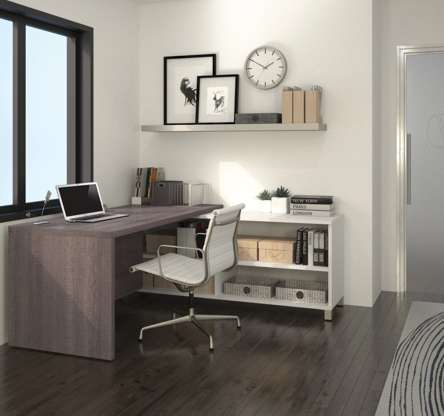 If you are looking for a modern desk with plenty of space to work and store your things, this may be the perfect solution for you. This desk sports two contrasting finishes: the main desk has a natural bark gray finish and is complemented by the white finish of the shelving portion. The two middle shelves are both adjustable to provide flexibility and there is space on top of the shelving to keep your printer or anything else you need to keep nearby. The surface of the desk is 71″ wide, plenty of room to spread out and work. If you still need more storage for your office supplies, you can add on the matching bookcase and file cabinet.