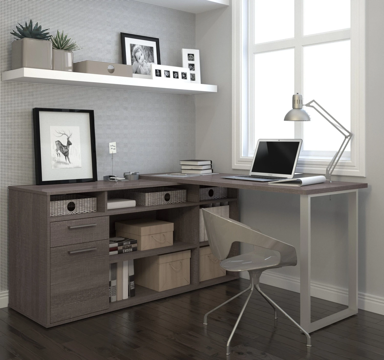 This clean, intelligently-designed desk from Bestar combines a modern, minimalist flair with integrated storage – making it perhaps the perfect modern desk!ย The premium surfaces are coated with melamine to prevent scratches and stains, and the contrasting steel gray leg ensures a steady work surface. The integrated open storage, file drawer, and utility drawer provide more then enough storage for your office items and files, and the design enables the top of the storage side of the desk to serve as additional desk top space. The desk comes with a 10-year warranty to give you peace of mind and is reversible, so that the primary desk top can go on either the right or the left, whichever you prefer.