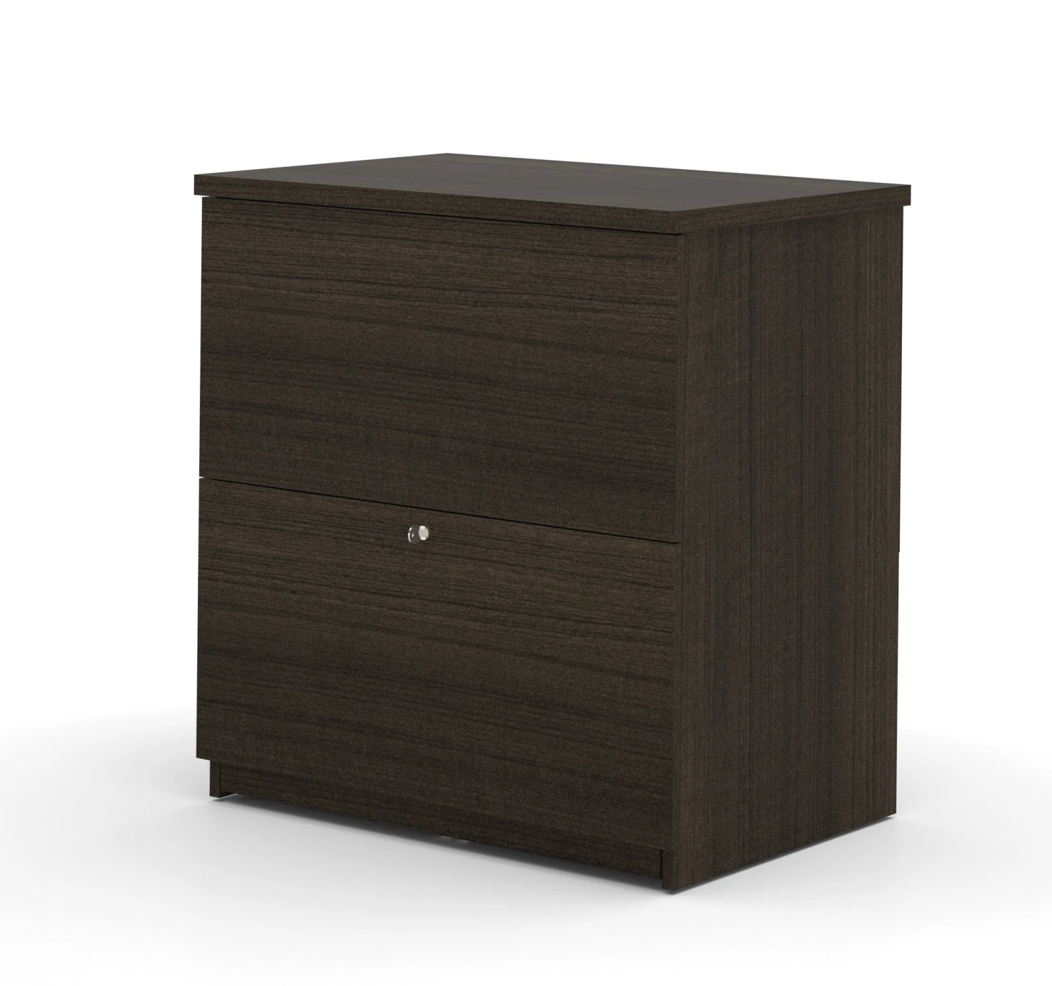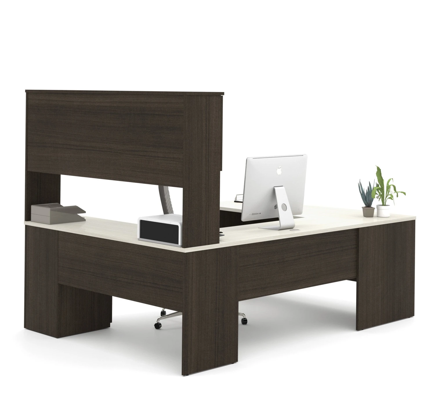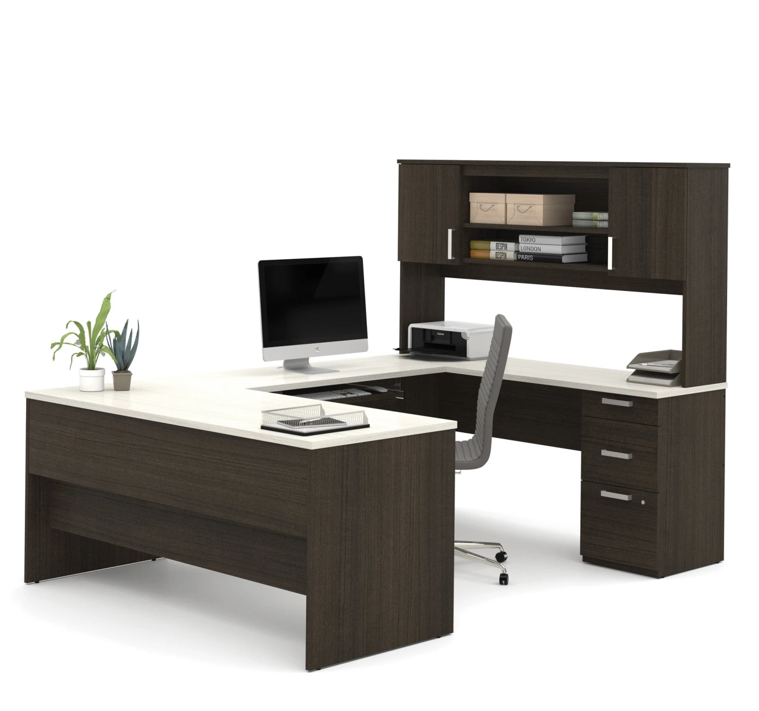 This elegant, two-tone u-shaped desk from Bestar features an elegant dark chocolate and white finish. Not only does it offer a unique, modern look, but it also offers excellent durability and functionality. The 10-year warranty ensures this is a premium product, and the melamine-coated surfaces help prevent stains and scratches. You will have ample space to spread out and work with the large u-shaped desk top, and you’ll also have space for all of your storage items with the roomy hutch, two utility drawers, and a locking file drawer.ย The brushed-nickel hardware adds a nice touch as well, and the piece as a whole communicates a clean, modern vibe.ย If you need even more space for storage, add on the optional dark chocolate file or bookcase.ย