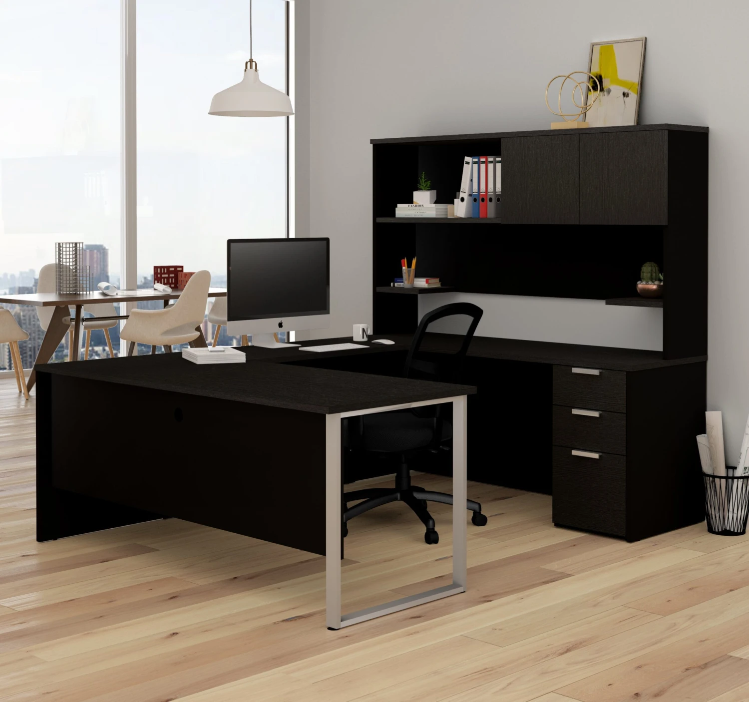 This elegant U-shaped desk with hutch features incredible functionality, from its extra large work surface to its locking pedestal of drawers to its large storage hutch.ย It is reversible as well, so the hutch & drawers can go on either side you prefer.ย The quality is overflowing as well, with premium edging, 1″ thick desk tops that are coated in melamine to prevent scratches, and a 10-year warranty to give you assurance that it will last.ย On top of all that goodness comes the elegant looks of the piece, with a fresh modern design and its sleek black & deep gray finish combination.ย If you need more storage for files, add on the optional matching lateral file.