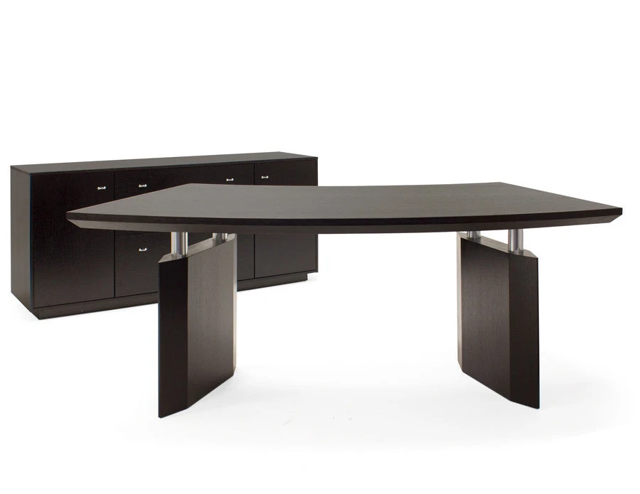 This exquisite, curved desk is supported by two sturdy wood veneer blocks and boasts two mobile file cabinets that slide underneath the work surface. The first filing cabinet offers four utility drawers, while the second has one file drawer and two utility drawers. If you need more space for files and the link, consider purchasing the equally striking credenza, also.