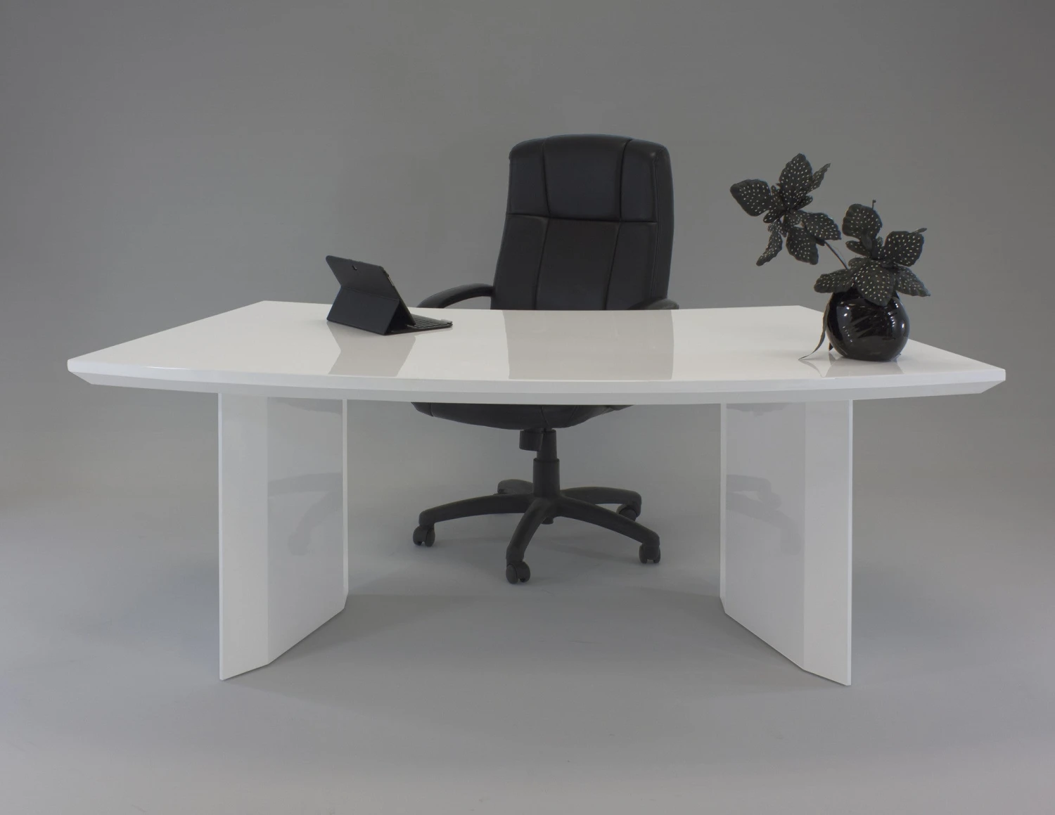 This gorgeous white lacquer modern curved desk is modern and eye-catching. Made of quality materials by one of the finest manufacturers around, Sharelle, it is certain to stand the test of time. It comes with two mobile file cabinets that can slide underneath the work surface, and its huge desk top will give you all the space you need to spread out. The first filing cabinet offers four utility drawers, while the second has one file drawer and two utility drawers.