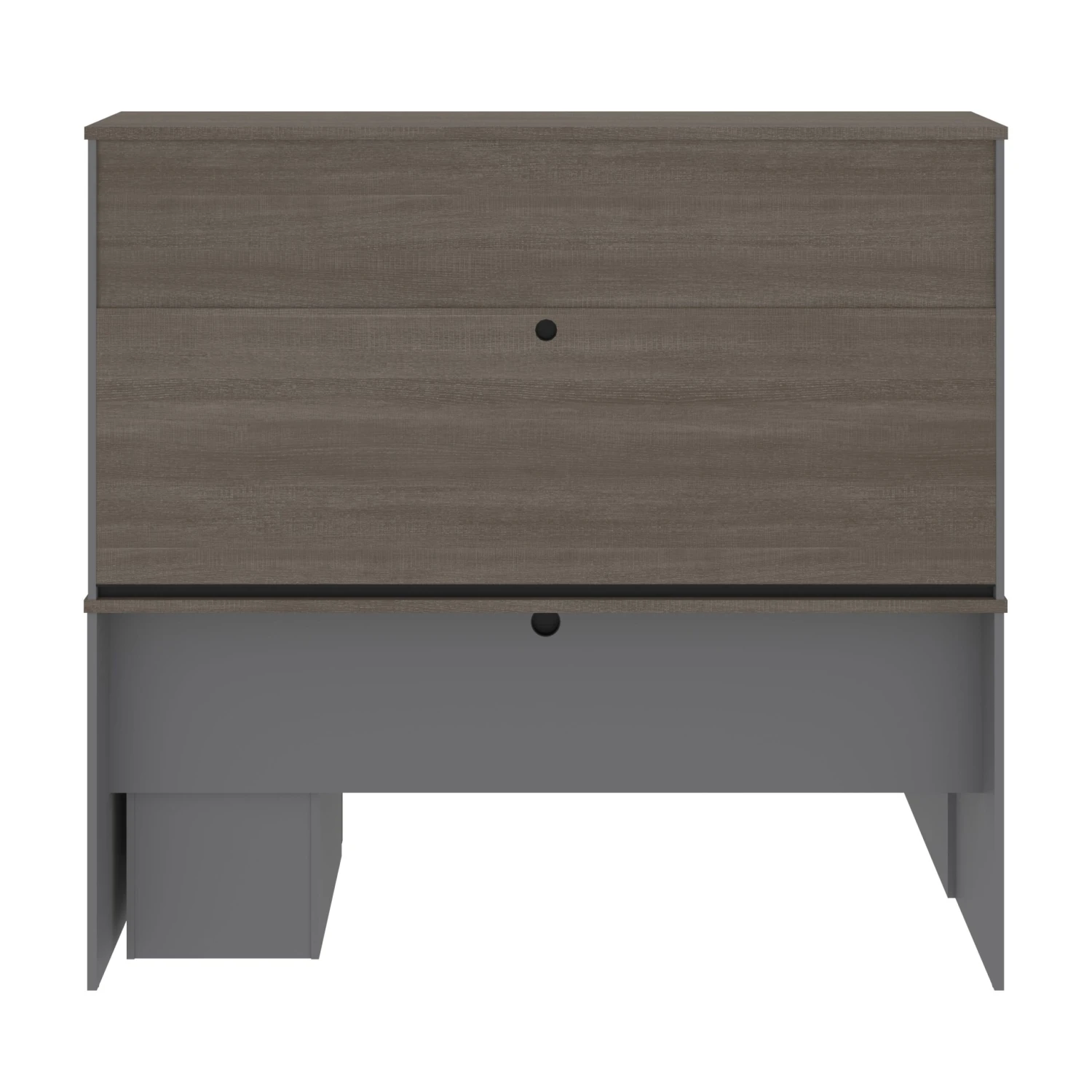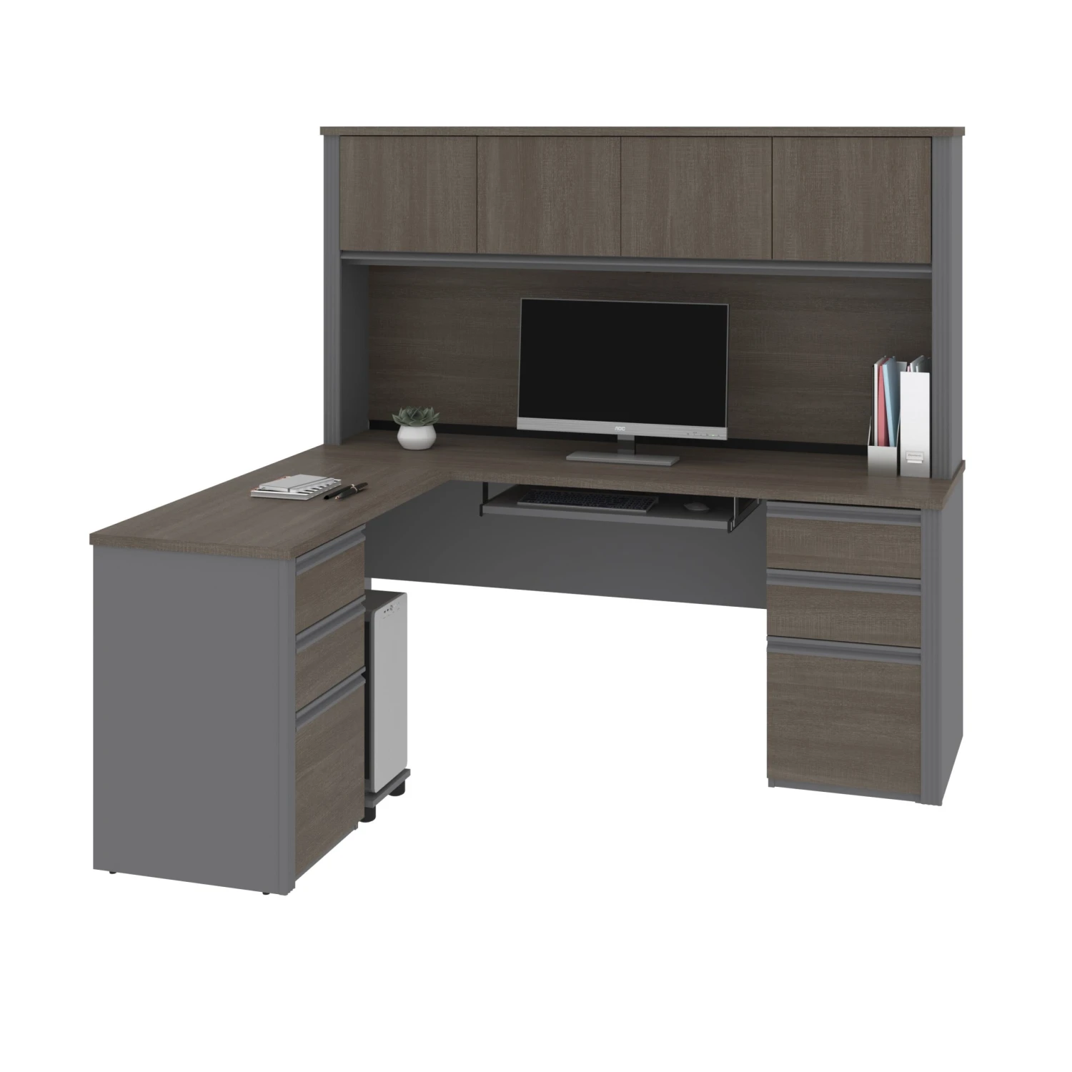 The quality of this stunning desk is evident in the function of its drawers and keyboard shelf that slide quietly on ball bearings, its melamine-coated desk top that won’t scratch or stain, and its premium, commercial grade surfaces & edges. It even comes with a 10 year warranty! And the functionality is off the charts with its four utility drawers, two locking file drawers, and plenty of space to spread out and work. The hutch holds four cabinets for more storage of files and other items. Finished in a professional bark gray and slate, this desk is refined and modern. Add a matching bookcase or file cabinet if you need even more space for storage.