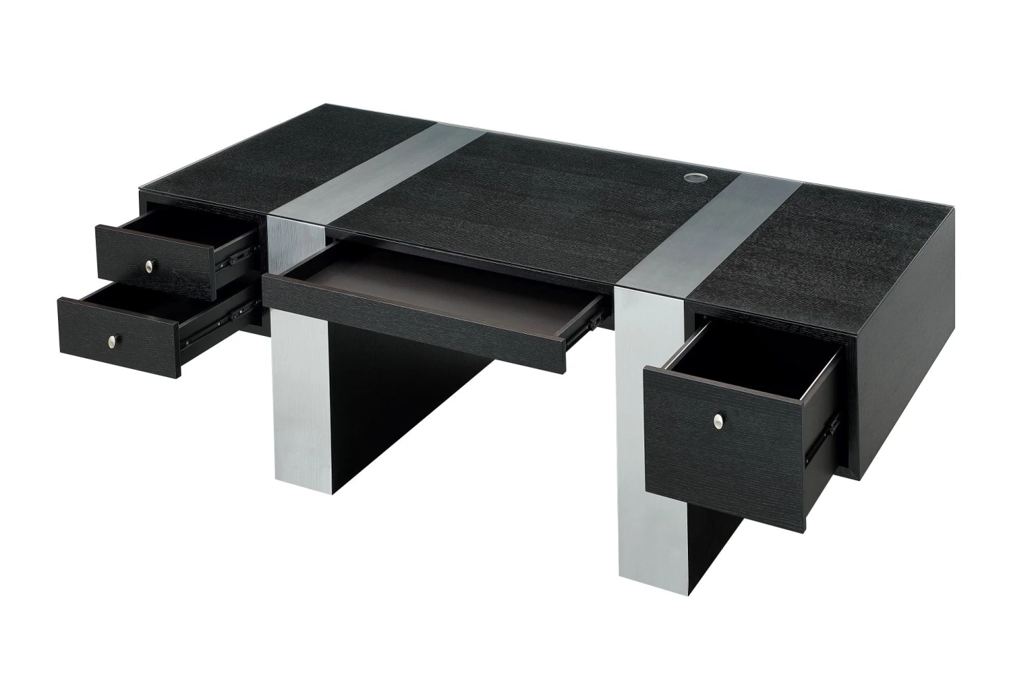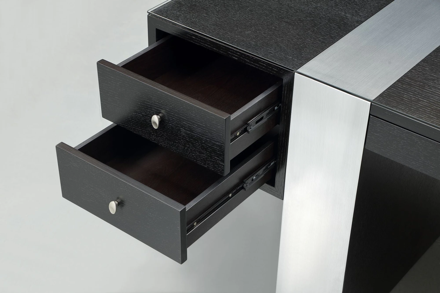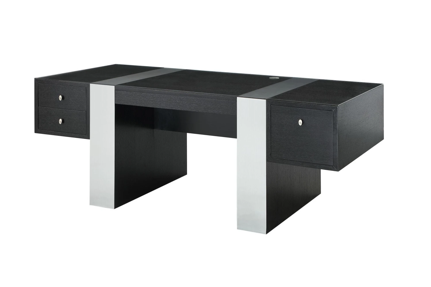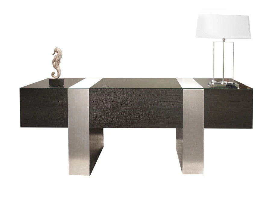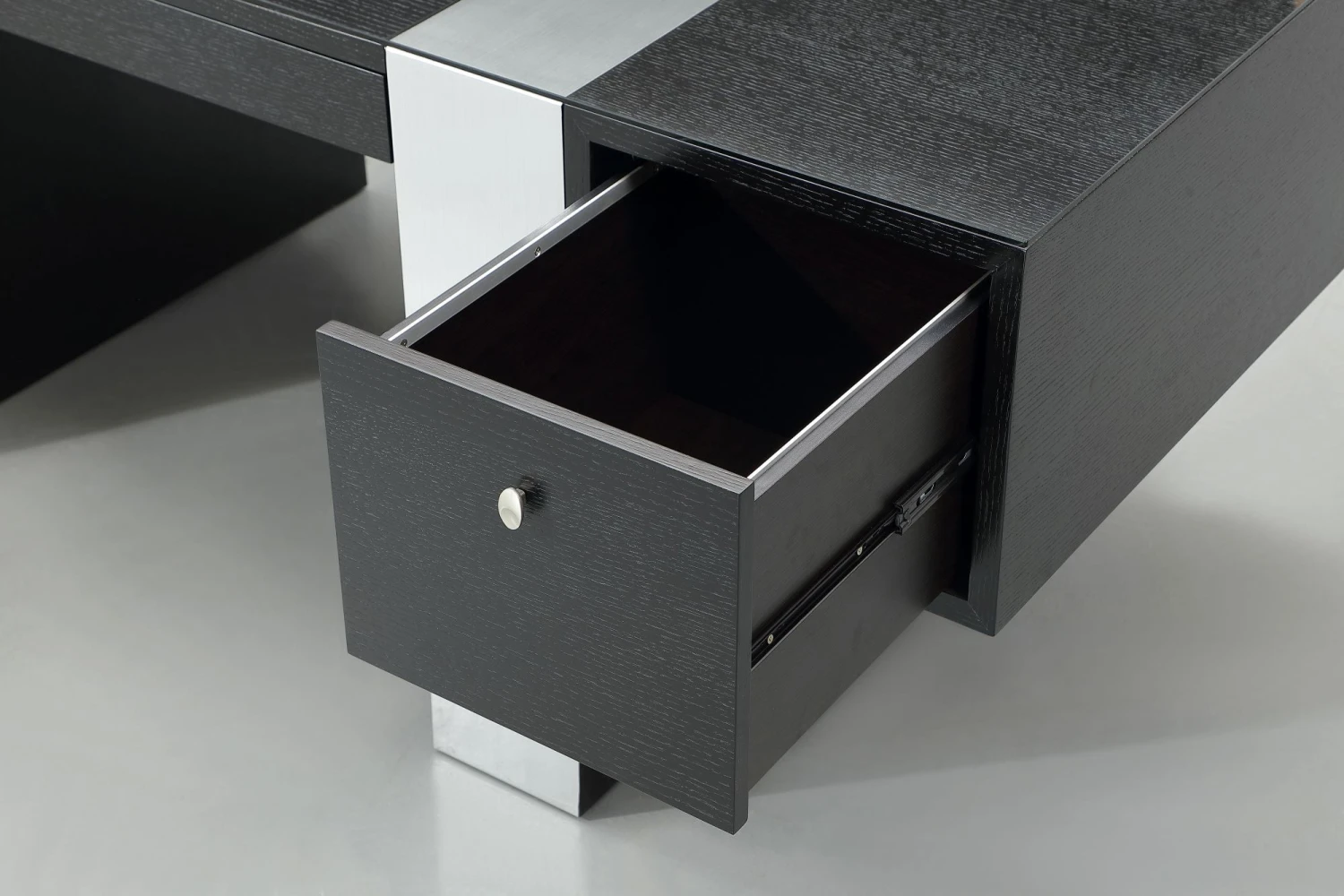 Welcome to a new world. This desk is unlike any office furniture you have ever owned. The chunky design is complemented by the wenge finish and the laminate accent strips made to look like brushed aluminum. You will also enjoy the wide desk top, ample file drawer, two utility drawers, and a central pencil drawer. If you need more storage space and want to fill out the whole room, add on the optional matching credenza!