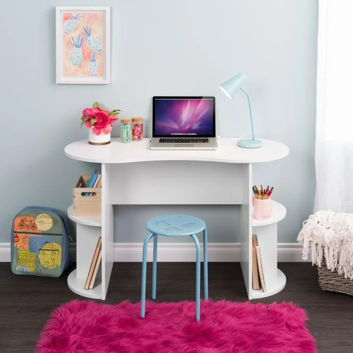 This unique student desk offers a broad surface for working, plus plenty of storage along the sides of the desk. Four shelves frame the center of the desk for keeping essentials close at hand, and the bright white finish blends effortlessly with a variety of decor. Made in North America!