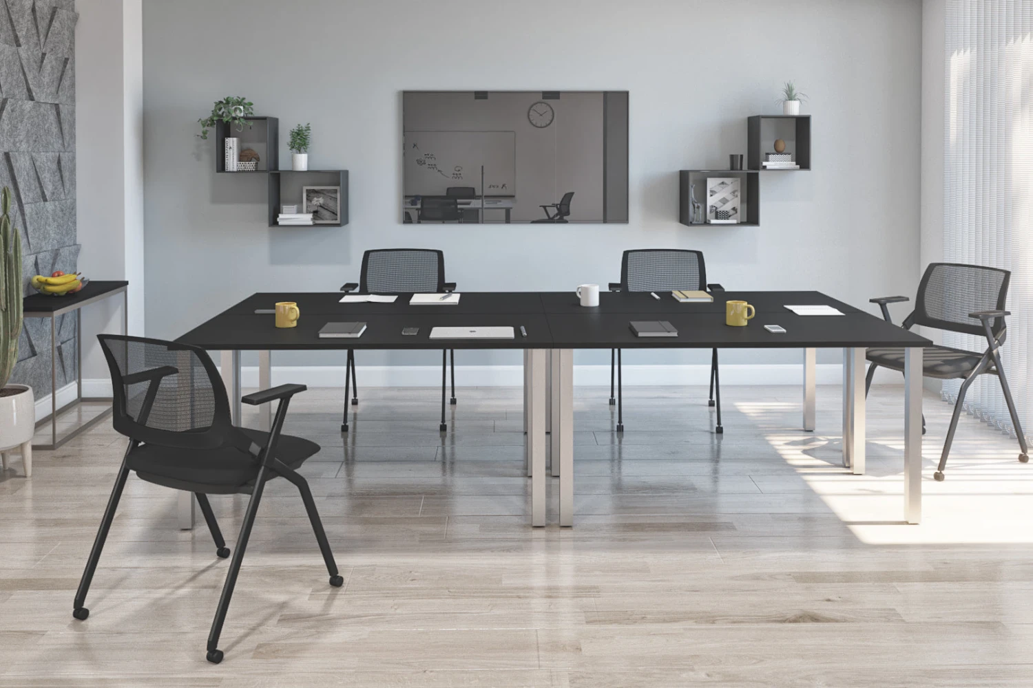 Set up a modular conference room effortlessly with these four desks. At 60″ wide, they each offer plenty of room for large projects, but put together, they can hold even the most unwieldy of projects effortlessly for a group effort. The flexible design allows for these desks to be joined together in a variety of ways. The ergonomic design includes a melamine-coated black top for lasting quality, plus four squared metal legs in a silver finish.