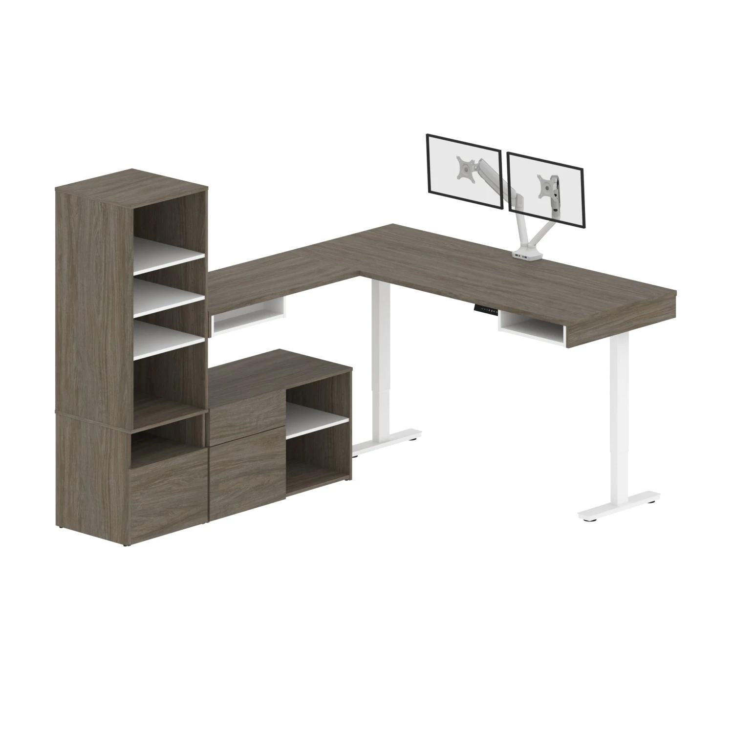 Accent an office with perfectly matching furniture through this set of two desks, each holding a generous amount of storage and an adjustable L-shape. Even the unwieldiest of projects becomes easy to tame with twin flexible monitor arms mounted on one side of the broad L-shape of each desk. A sleek walnut gray finish on the main surface of the desk, set off by white accents, completes the look. Two broad work surfaces apiece allows for plenty of room to stretch out even a large project, while a built in 5-shelf bookcase, credenza, and two under-desk pockets offer a massive amount of storage per desk. For full customization, the design is fully reversible, and the entire work surface shifts height with the press of a summary to a variety of settings. Comes with a 10-year manufacturer’s warranty for peace of mind that you are receiving a quality product. If you are in need of even more storage for your office, consider adding on the optional matching bookcase and locking file cabinet.