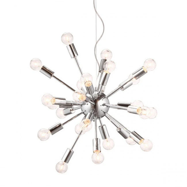 Ad a spark to your office design with this eye-catching hanging ceiling lamp. It is made from shining silver chrome, and has bare bulbs, all pointing outwards from a spherical center.