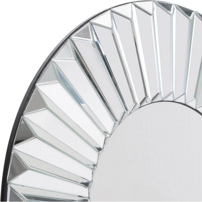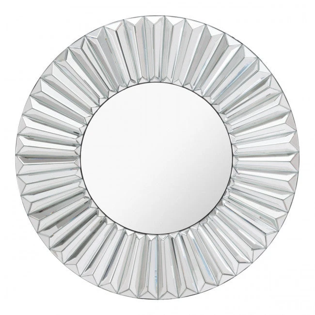 Add a little extra light and warmth to your office with this round mirror. It features an absolutely stunning frame, finished in silver,ย hasย angular geometric ripples radiating out from the flat mirror in the center. This mirror is beautiful and elegant, and will add sophistication to your modern office.