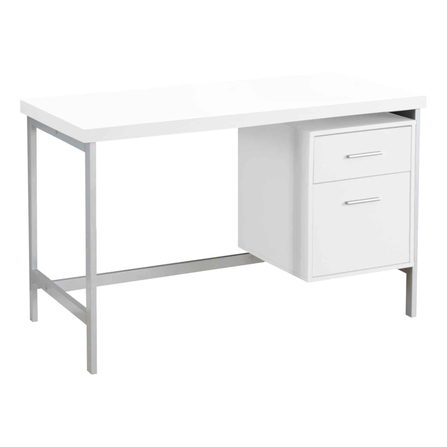 This gorgeous desk is compact and elegant, a great choice for a small or at-home office. It has a glossy white finish with silver hardware and legs. The two drawers are perfect for storing files and office supplies.Â