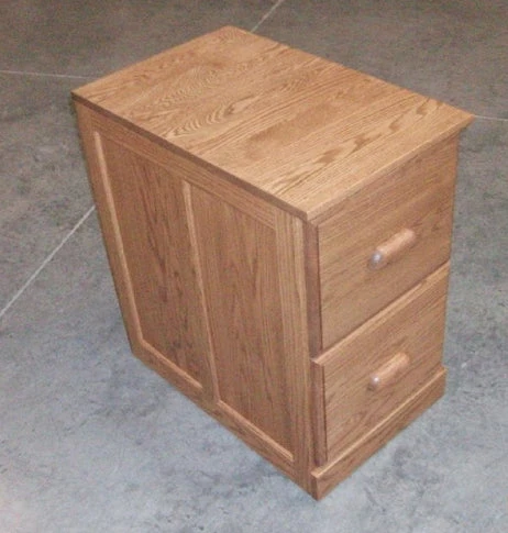 This gorgeous, incredibly high quality piece from Haugen is certain to pass the test of the finest furniture inspector.ย It is handcrafted to order of the finest red oak, and then hand-rubbed with your choice of finish: beechwood, caramel, espresso, merlot, or sand (finishes appear in this order).ย The drawers are lacquered and slide on precision ball bearing glides for smooth and silent operation, and the oak drawer pulls adds to the premium quality.ย This is an heirloom piece that is crafted on order and will last a lifetime.ย This can be made to fit either letter or legal sized files.