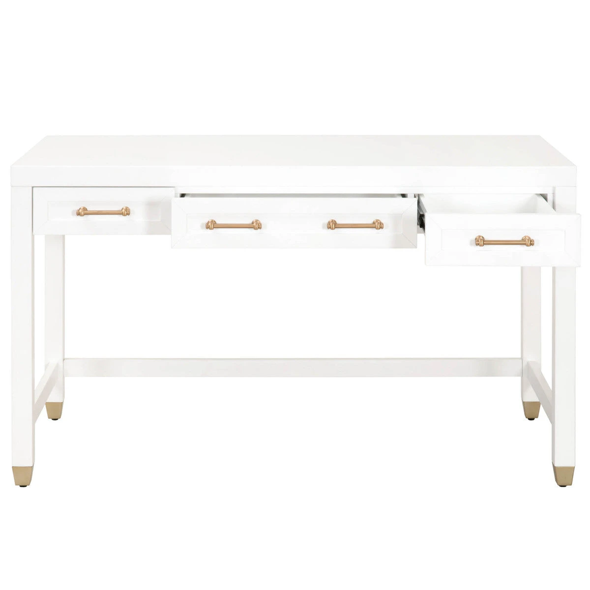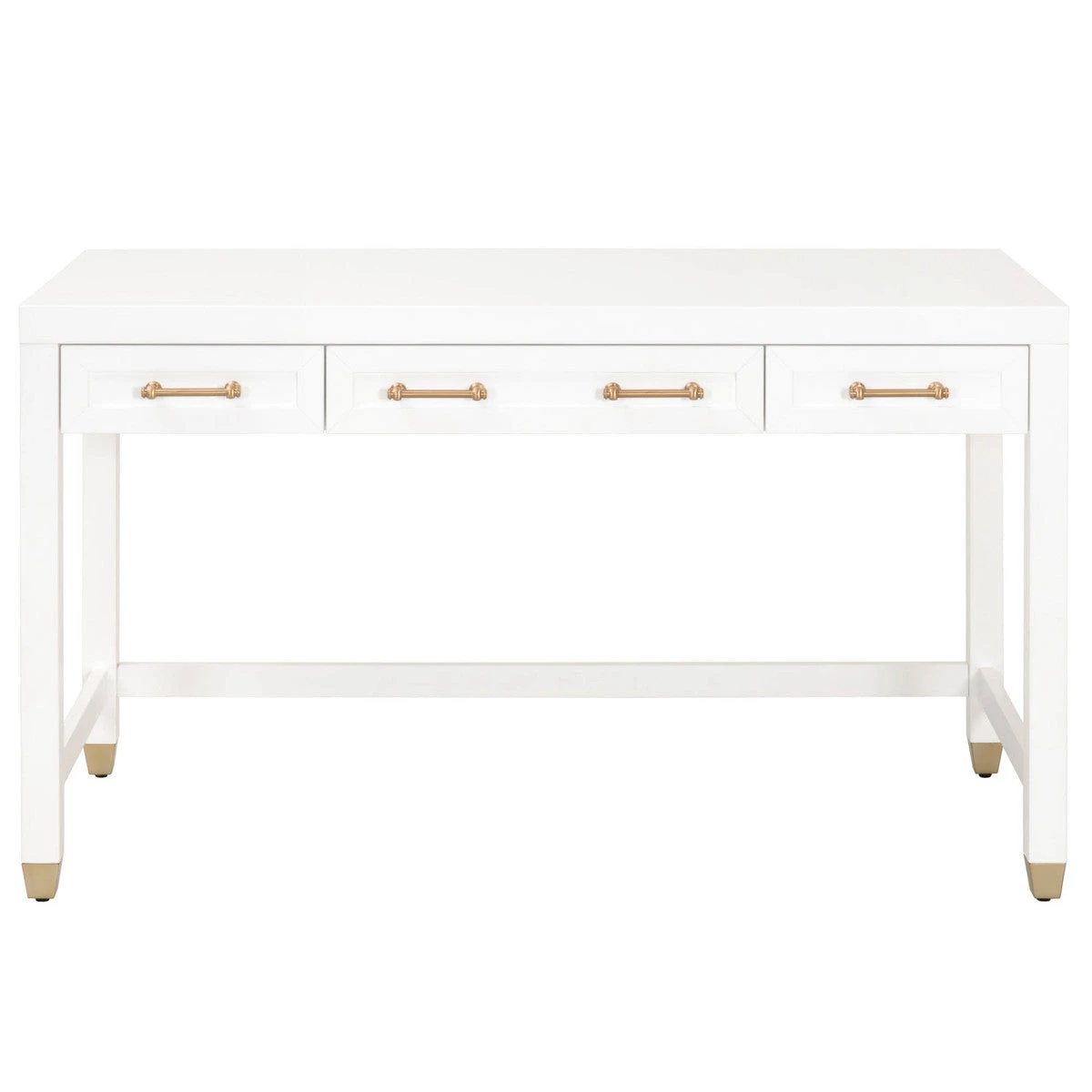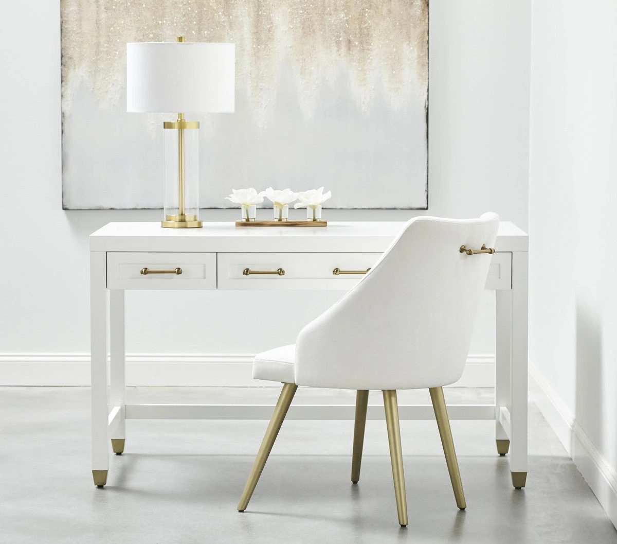 This classy option from Star features contemporary lines, but with a vintage style. Its matte white lacquer finish combines beautifully with brushed brass handles and feet, and the large desk top and storage drawers make it a functional place to sit and work. The three drawers are on full-extension glides, and the finished back means you can place this either against a wall or in the center of your space.