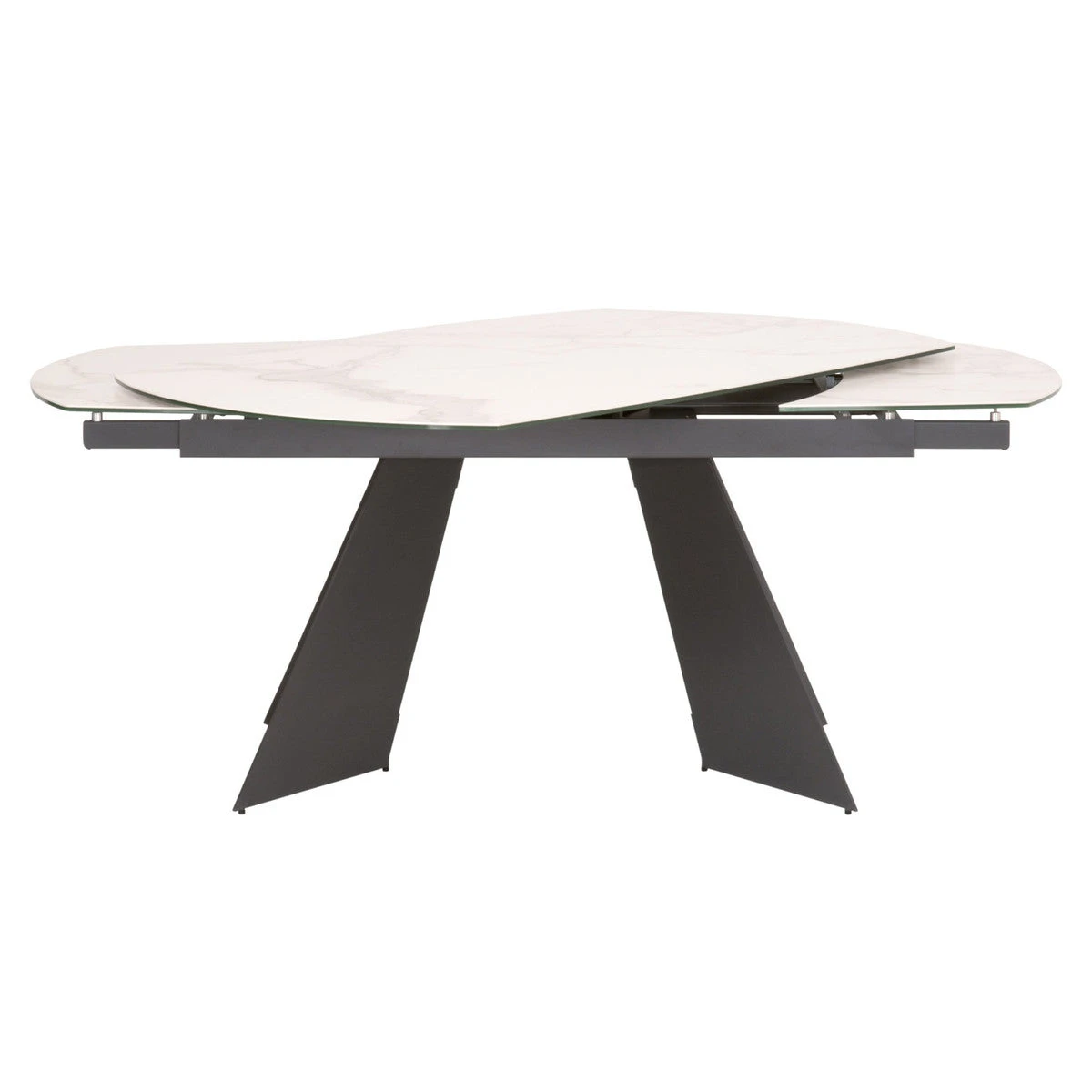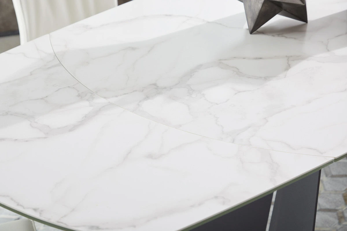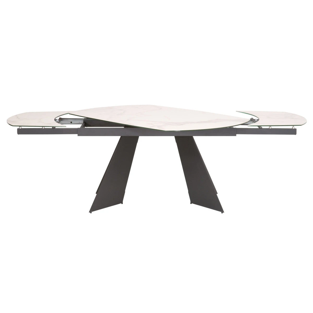This unique conference table features a white ceramic top that looks like marble, sitting on a matte dark gray steel base. The top has extensions that store underneath when the table is in its smaller, 63″ wide configuration. They fold in and out by spinning the table top, making contracting or expanding quick and easy. The modern design and premium quality will have your office looking sleek for years to come.