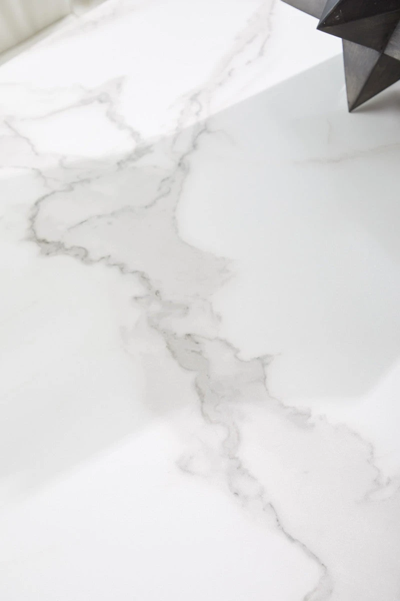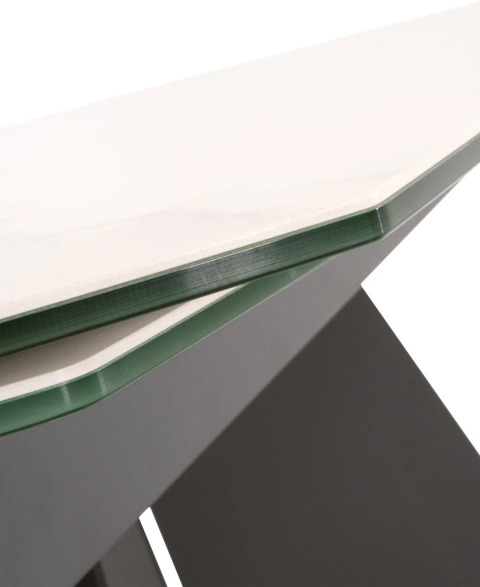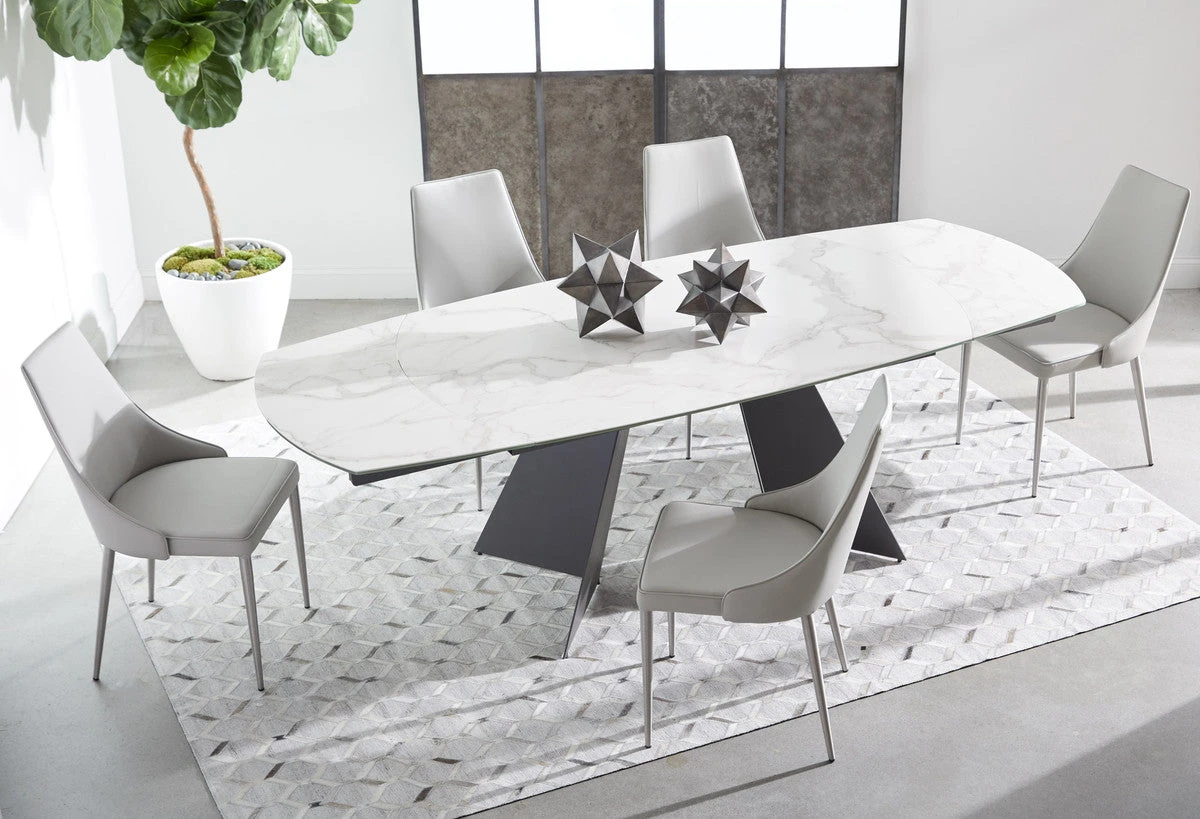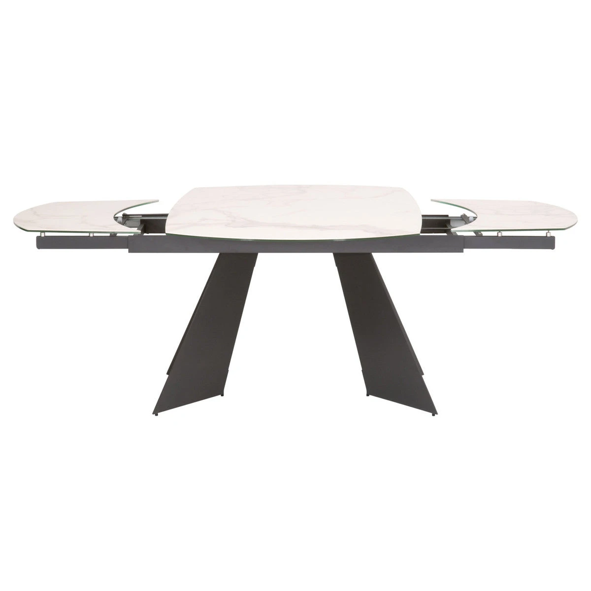 This unique conference table features a white ceramic top that looks like marble, sitting on a matte dark gray steel base. The top has extensions that store underneath when the table is in its smaller, 63″ wide configuration. They fold in and out by spinning the table top, making contracting or expanding quick and easy. The modern design and premium quality will have your office looking sleek for years to come.