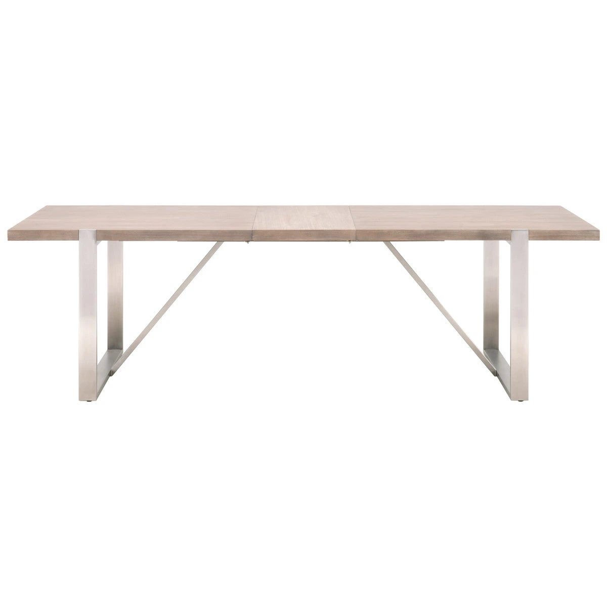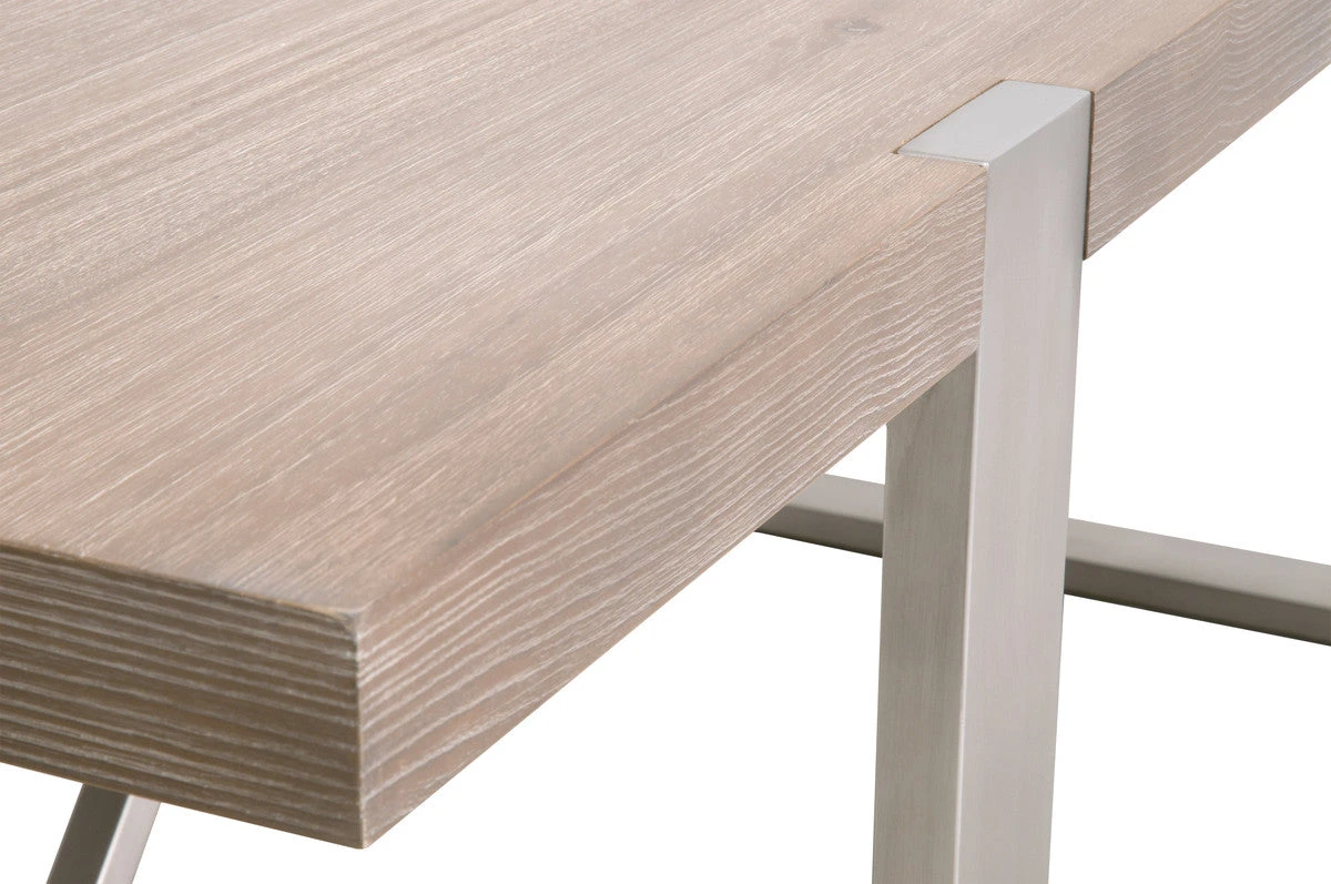 This modern conference table or executive desk features a natural gray acacia veneer top, which contrasts nicely with a brushed stainless steel base. Its clean lines and elegant finishes will add a chic look to any office space. You can use this piece as a large executive desk or as a conference table, and the top can be quickly extended with the central leaf.