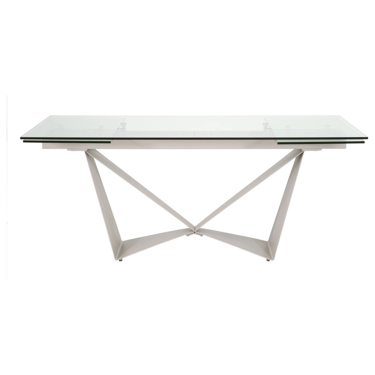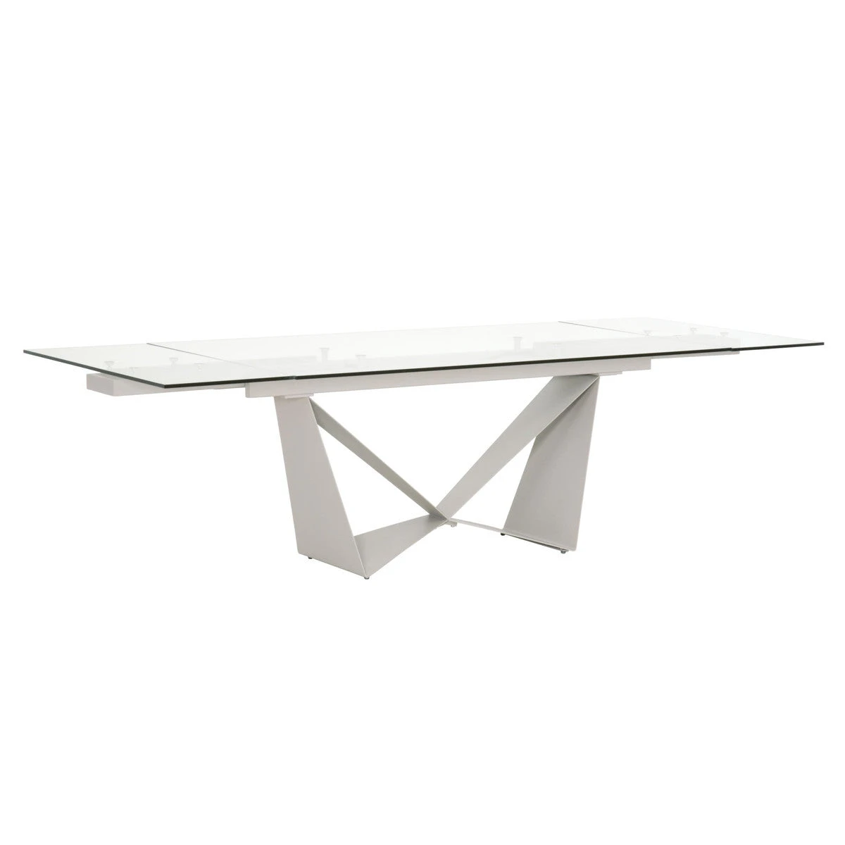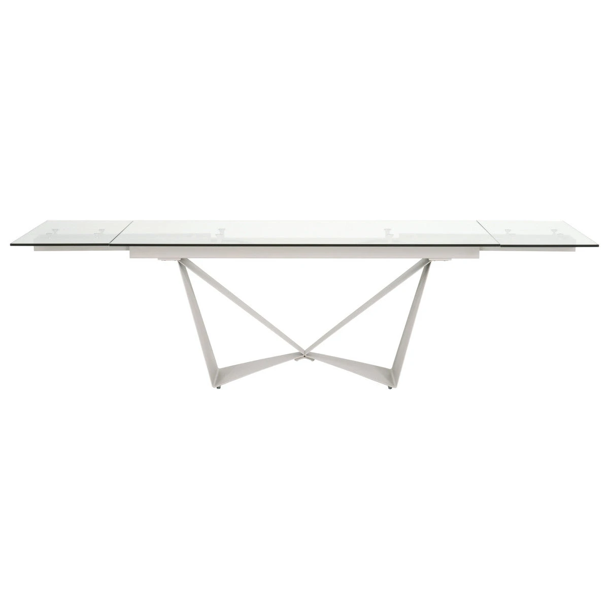 This head-turner was an immediate best-seller! Its geometric, airy, light gray matte steel base is utterly unique, and its high-quality 12mm tempered clear glass top adds to the modern look and is also very functional. The top extends on each end, transforming from 71″ into a nearly 11-foot-long conference table. Or, if the extensions are stored back under the primary top, this piece can serve as an excellent executive desk or small meeting table.