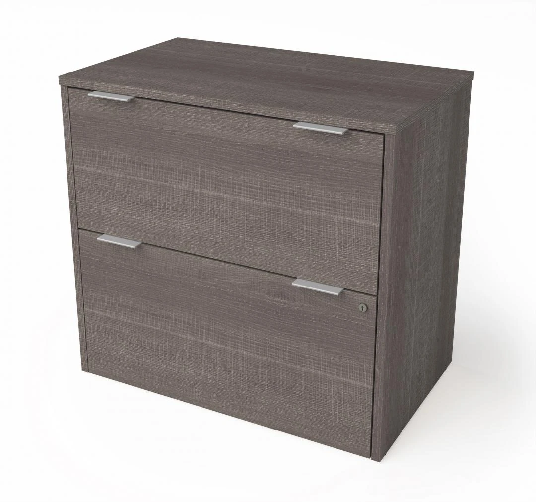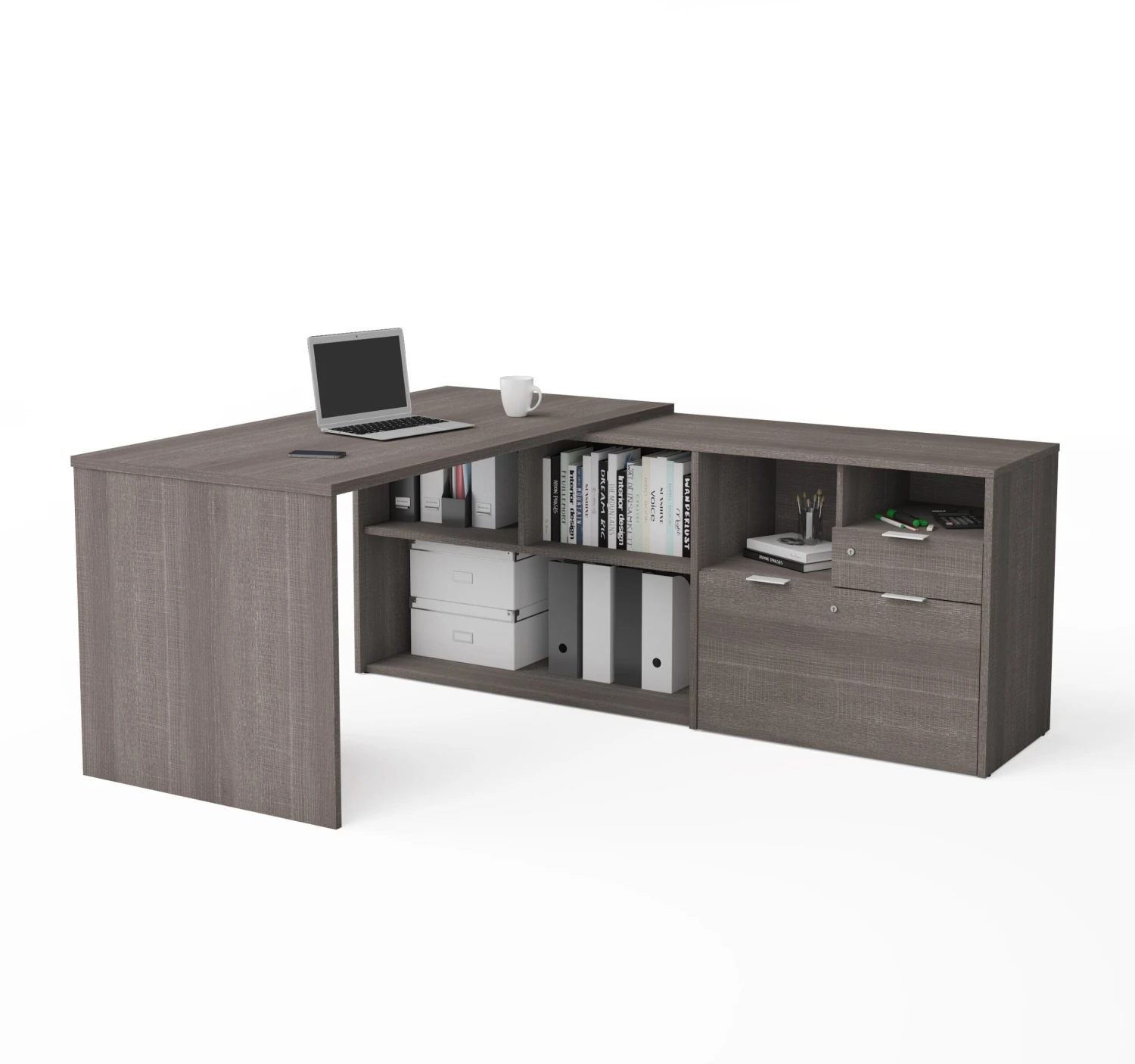 This charming desk from Bestar is both functional and stylish. It provides more than enough space to work and has a stunning bark gray finish coated in melamine to prevent scratches. Integrated into the desk is a spacious amount of storage, including five shelves of varying sizes, a storage drawer for supplies, and a file drawer. If you need more storage, there’s a matching file cabinet that can provide even more space for storage.