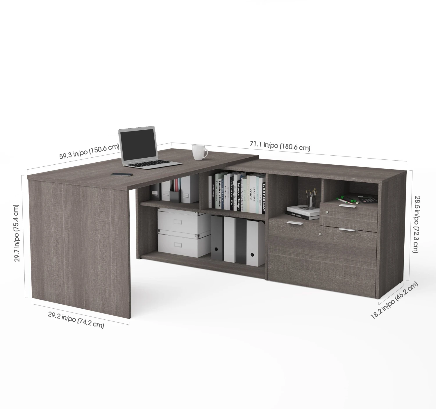 The dimensions of the desk are 71″ W X 59″ D X 29.5″ H. The dimensions of the file are 30″ W X 18″ D X 28.5″ H.
