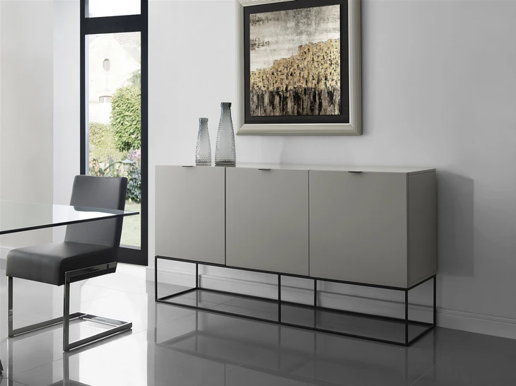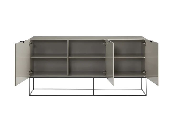 An elegant black base complements the high gloss taupe lacquer of this credenza, combining for a unique and impressive look. The three large cabinet doors open to reveal ample storage, for paper, office items, or whatever might need a place. And the top is perfect for decorative items or for your printer, scanner, or whatever needs a place. This piece will add a modern, contemporary flair to any office space!