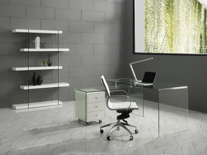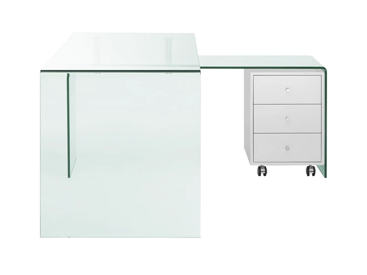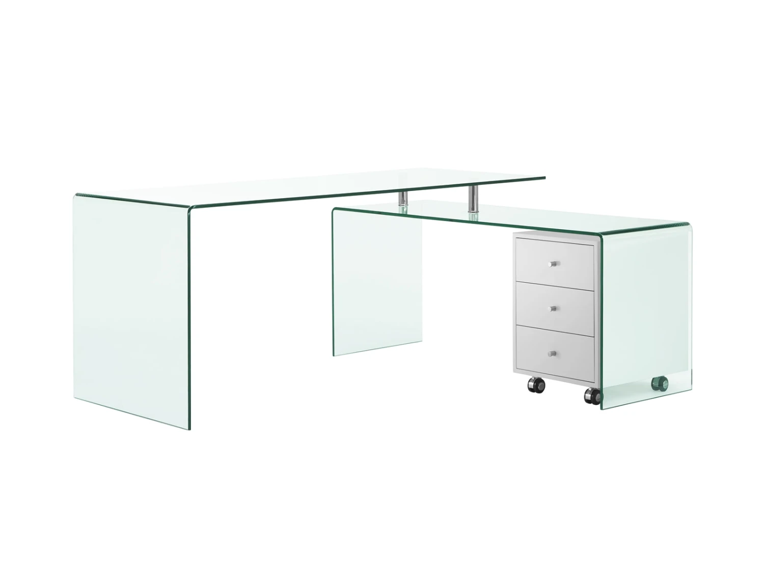 This gorgeous, modern piece is clean, elegant, and minimalist.ย It features a two level work surface made entirely of glass, rounded on the edges for a smooth, luxurious look.ย The top surface is connected to the lower surface with chrome supports, adding to the modern looks, and included is the rolling white three drawer cabinet, providing you a place to put office odds and ends.ย This piece is the essence of clean, elegant, and modern!