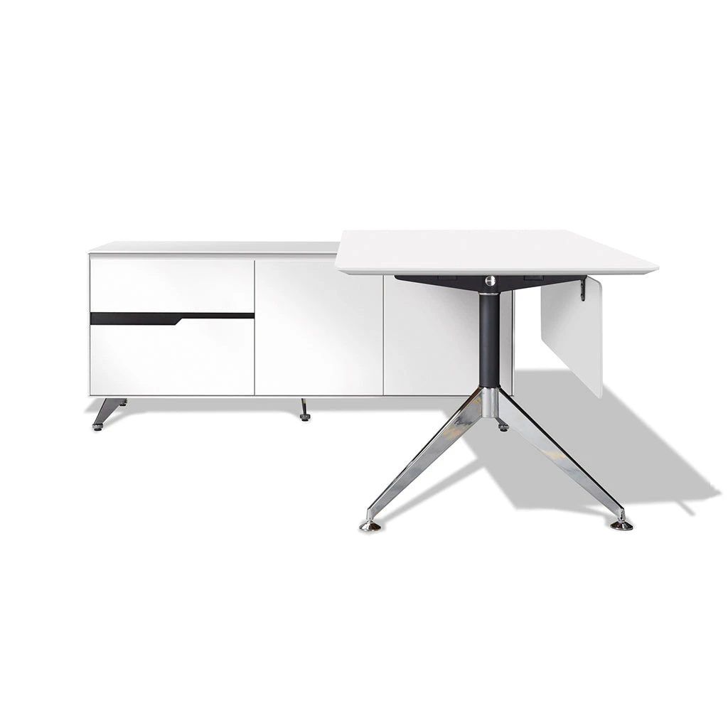We guarantee that you will feel like a power player at this luxurious desk and adjoining cabinet, both of which are decked out in white lacquer with chrome accents. Store supplies in the two drawers and multiple compartments of the cabinet, while enjoying ample, scuff-free desk space on the workstation. The desk also offers height-adjustable feet and a power plug-in for added convenience. The 5-year warranty may have you so excited that you may want to consider the optional credenza, too.ย