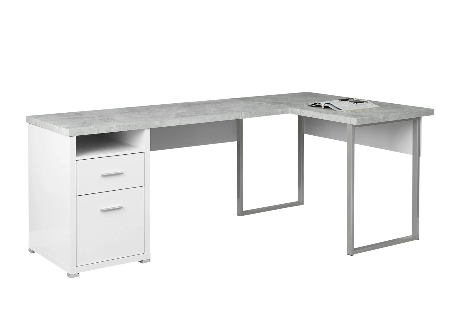 This unusual corner desk by Monarch offers a remarkably sturdy surface through an unusual medium: concrete! The solid concrete top adds interest and weight to the desk, while the airy gray metal legs keep this desk from seeming too weighty. The pedestal offers two drawers and a cubby for storage and easy access to supplies throughout the day. The entire desk is reversible to best fit your office, and the clean, simple design blends in with a variety of modern office decor.