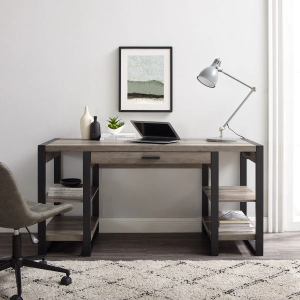 Distinctively urban in design, this executive desk offers plenty of storage within an open frame. Four shelves tucked beneath the main surface grant room to keep folders, binders, books, and other materials close at hand. A drawer in the center of the desk is perfectly sized for pens and office supplies. The generous 60″ top can hold even the most sprawling of projects, with extra space to hold personal items or decor. In a refined gray woodgrain finish with black metal accenting, it blends with a variety of office designs.