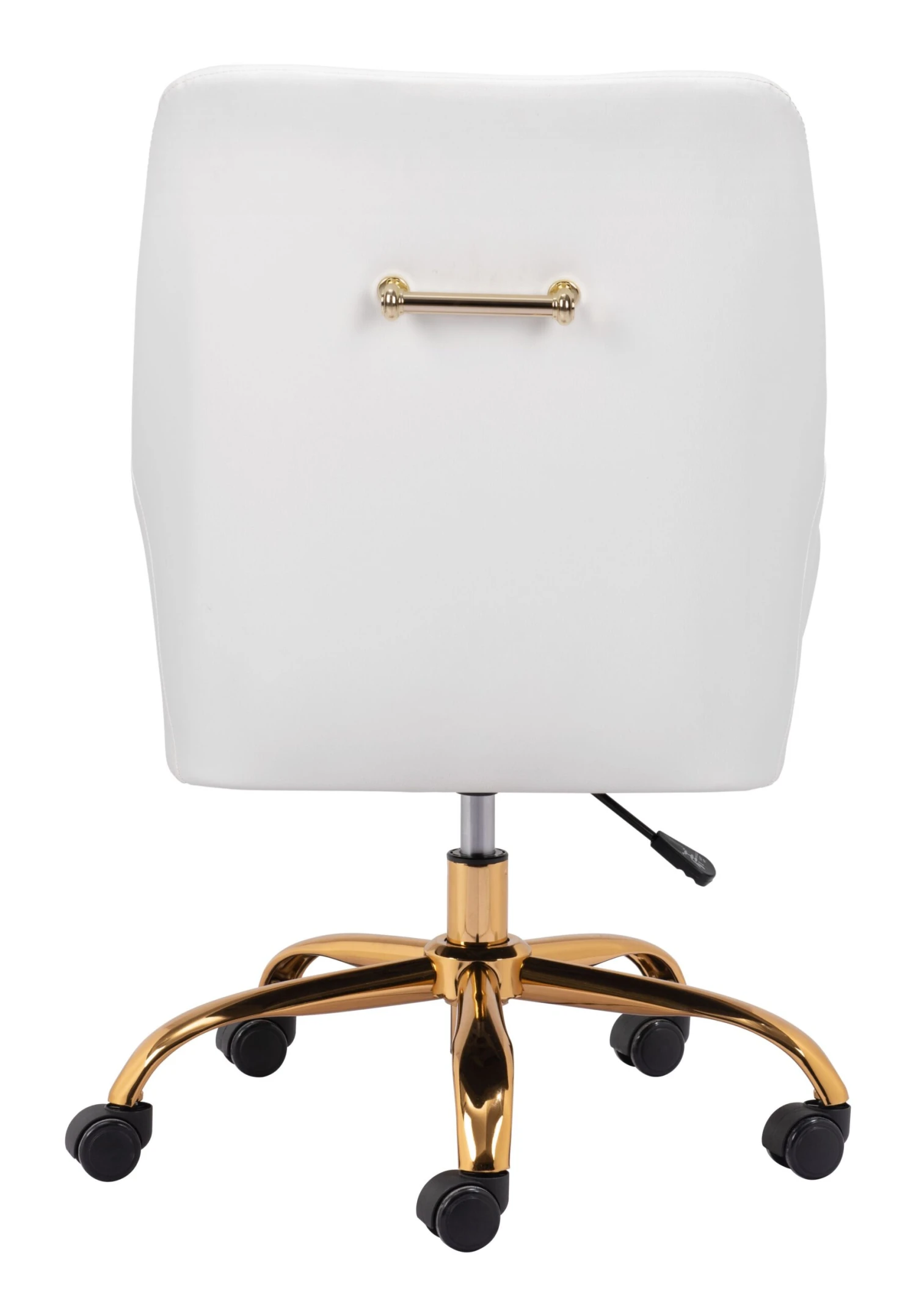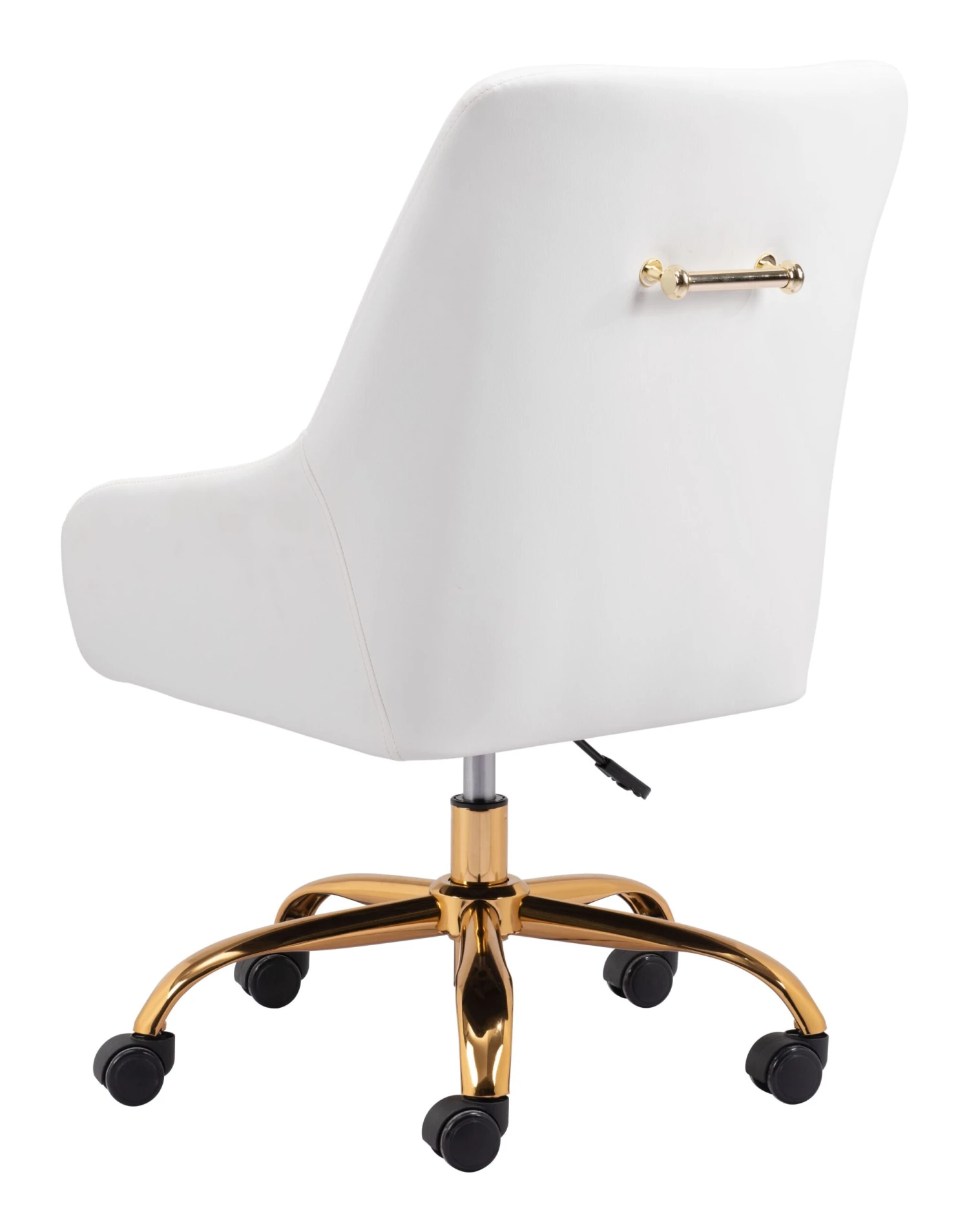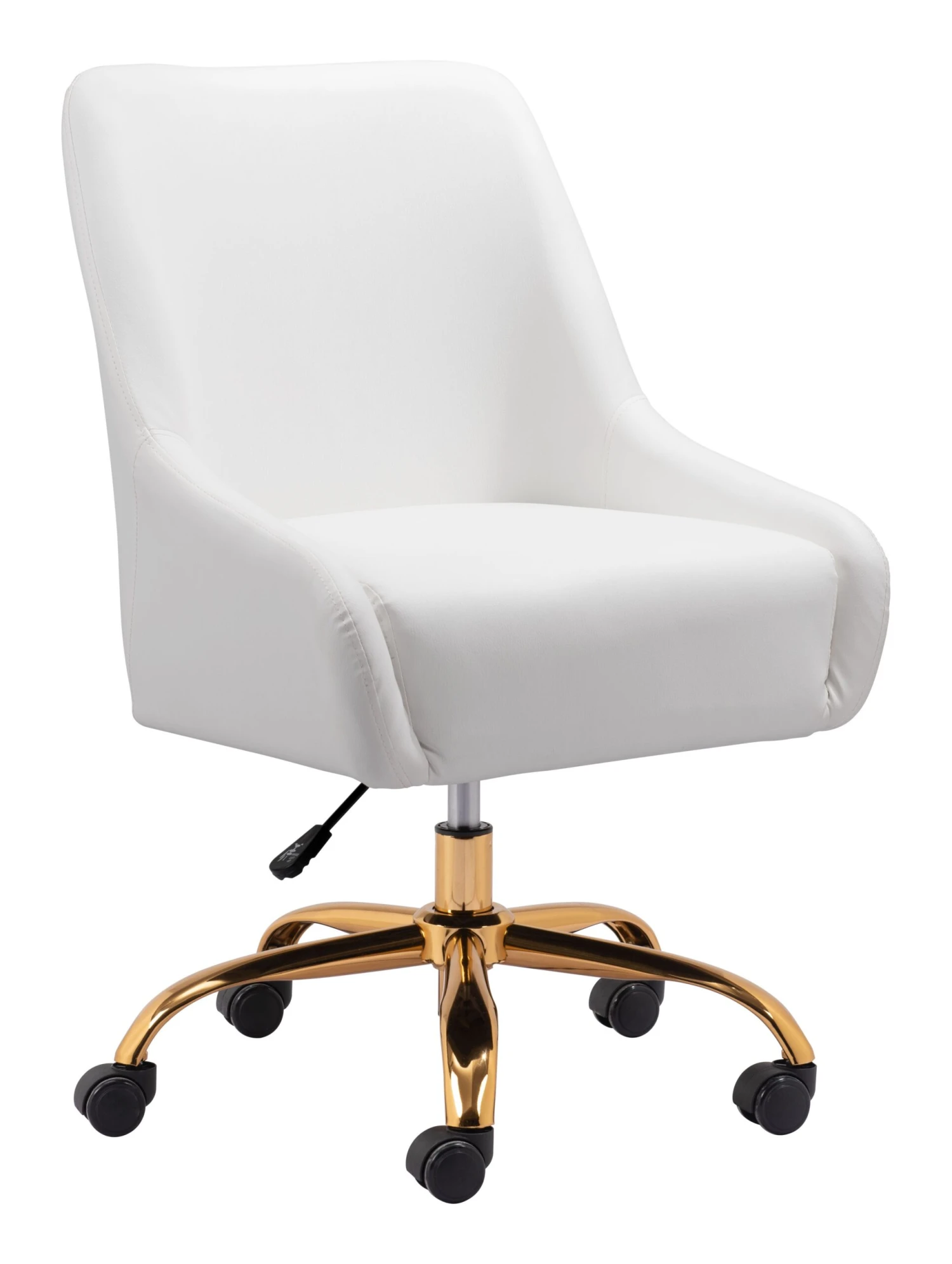 This stylish office chair is ideal to complete your modern office style at home or at your business. Its sleek design includes vinyl wrapping and a steel base with castors for easy movement and height adjustment. The 360-degree swivel base and convenient backrest handle make navigating this chair a breeze. It can support up to 330 pounds, making it a reliable choice.
